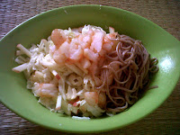 I make the dressing directly into the bowl, putting all the ingredients in together and mixing them quickly with a fork. The lime I reserve for the end, to squeeze on top of everything. Put some olive oil in a saucepan over med-high heat, and when it starts to shimmer, (about 1 min) add the prawn with a sprinkle of salt, and cook them off until they turn pink in color, about 2 minutes, depending on the size of your prawn. Turn them once or twice while they’re cooking, but make sure you let them sear (get a nice golden crust). When they are done, remove from the pan and let cool down a little bit. Meanwhile, chiffonade the cabbage, (cut into thin strips) and add to the bowl. Halve the apple, cut it into thin planks, and cut those into matchsticks, and add them in as well. (If you are making this ahead of time, you will have to put the apple in some water with a little bit of lemon juice or else it will brown.) Rough chop the cashews, and toss everything together in the bowl, (I just use my hand). By this time the prawn have cooled off, so cut those up into smaller pieces and add these on top of the salad. The soba noodles should be cooked ahead of time, (I like to keep a small container on hand when I am on a high carb rotation, as I make a couple of dishes on that day with them), so measure out a small handful, toss them in the saucepan that you cooked the prawn in to absorb some of the scraps of meat and flavor, splash some rice vinegar and a dash of salt on top, and add that to the plate as well. To finish, simply squeeze the lime juice over everything and voila, an irresistible high carb meal is made!