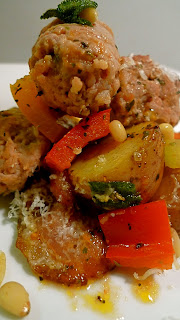 I made this during the minus 16˚ F weather I experience in Beloeil back in January. Beyond Cold! This is a truly warming dish, and combines the spicy richness of a quality house-made sausage with baby potatoes, sweet red and yellow peppers, fresh basil, toasted pine-nuts and the tang of grated parmesan cheese and fresh lemon.