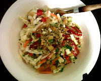 For some reason I have developed an incredible craving for salads, and I really try to listen to my body’s cravings, (unless they are obviously unhealthy) so I’ve been experimenting with some of the local produce over the last few days, and also taking advantage of my carb loading meals to use some different cereal grain products and legumes. This salad came about when I had some left-over chick-peas that I’d soaked and cooked off last night in advance of making some chick-pea patties, (I’ll post that recipe this weekend). I taste-tested on of the little guys, and fell in love with the nutty, buttery flavor all over again. I’ve been promising myself that I would work on some non-meat recipes while in India, but this really is the first one that I’ve come up with since I’ve been here. A great book to have in your library if you aren’t trained in nutrition is, “Becoming Vegetarian” by Melina Vesanto and Brenda Davis. It’s very easy to read, is full of great recipes, and really breaks down the nutritional value of foods, what an amino acid is, how to balance vegetable proteins to complete them, etc. I recommend it to students who aren’t even vegetarian but who are eager to know more about what food is all about.