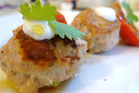 Whisk the egg with the rest of the ingredients in a medium-sized bowl. Break up the turkey into the mixture and continue mixing by hand until all the ingredients are incorporated. Form into small 1 oz balls, (about the size of a golf-ball). When you are ready to cook them, get a non-stick skillet up to temperature, (medium-high heat will do) and put in about 1 T of toasted sesame oil. When the oil starts to shimmer, simply add your meatballs. You may have to cook them in batches, as they should not be touching each other. Let them sear completely on one side before turning over. I usually cover mine and let them steam a little so they stay more moist and tender. They should only take about 3 or 4 minutes to cook, and again be sure to not overcook them as otherwise they will become hard like golf-balls! They will continue cooking in their own heat for about a minute! I serve mine with a little dollop of creme fraiche, a drizzle of olive oil, some fresh cilantro, squeeze of lemon and a few oven-roasted tomatoes…Enjoy…!